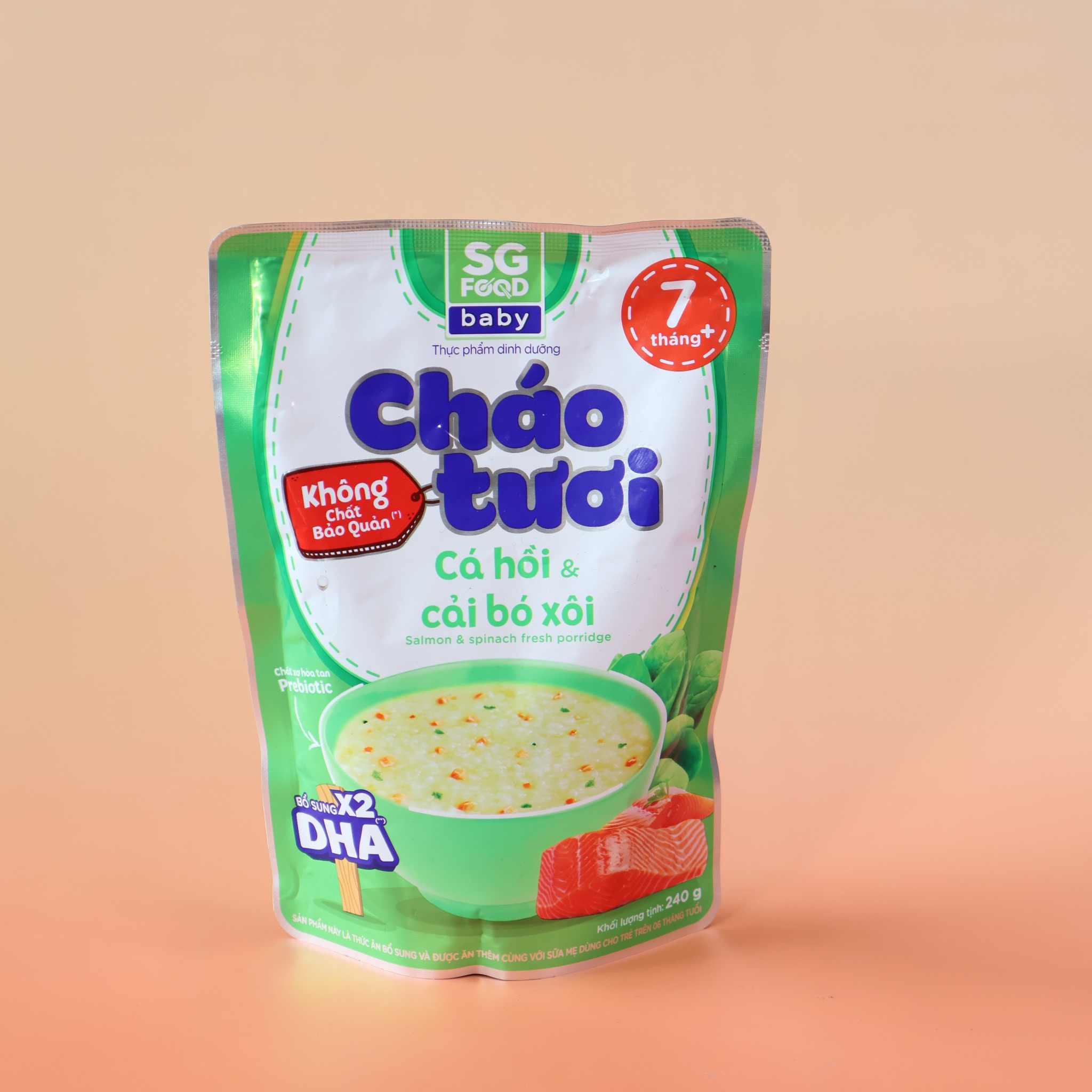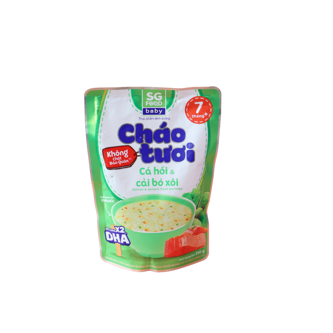 Cháo tươi SG Food vị cá hồi, cải bó xôi (240g) là sản phẩm dinh dưỡng tiện lợi, kết hợp giữa cá hồi giàu Omega-3 và cải bó xôi giàu chất xơ, vitamin giúp hỗ trợ phát triển trí não, thị lực và hệ tiêu hóa cho bé. Cháo được nấu chín sẵn, đóng gói tiệt trùng, không cần bảo quản lạnh, phù hợp cho trẻ từ 7 tháng tuổi trở lên đang trong giai đoạn ăn dặm.
